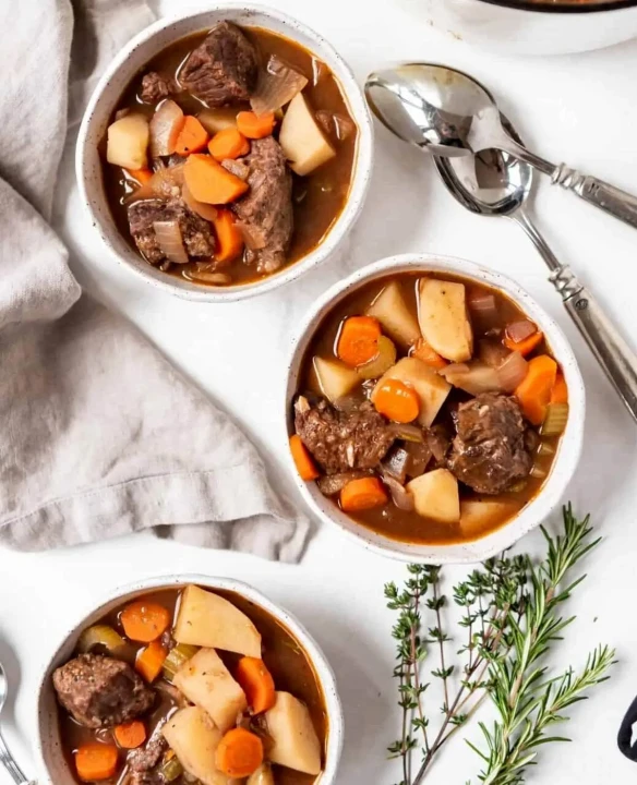 در این مرحله 7 لیوان آب گوشت، 1 قاشق غذاخوری سس ورچستر، نصف قاشق چایخوری رزماری خشک، نصف قاشق چایخوری آویشن خشک، هویج خرد شده، سیب زمینی و کرفس خرد شده را به همراه تکه های گوشتی که تفت داده بودیم به قابلمه اضافه می کنیم. 2 عدد برگ بو را هم داخل قابلمه می اندازیم و درب قابلمه را می بندیم و اجازه می دهیم برای مدت 2 الی 3 ساعت بپزد.