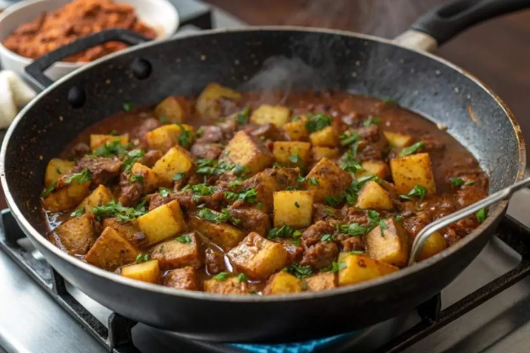 در آخر آب یک عدد لیموی تازه را روی مواد بفشارید و در صورت نیاز دوباره نمک و فلفل تنظیم کنید. کمی دیگر اجازه دهید مواد جا بیفتند. هنگام سرو، سیبزمینیهای سرخشده را روی غذا یا کنار آن قرار دهید. بهتر است با غذا مخلوط نشوند تا تردی خود را حفظ کنند. این غذا را میتوانید با نان تازه یا همراه با کته سرو کنید.